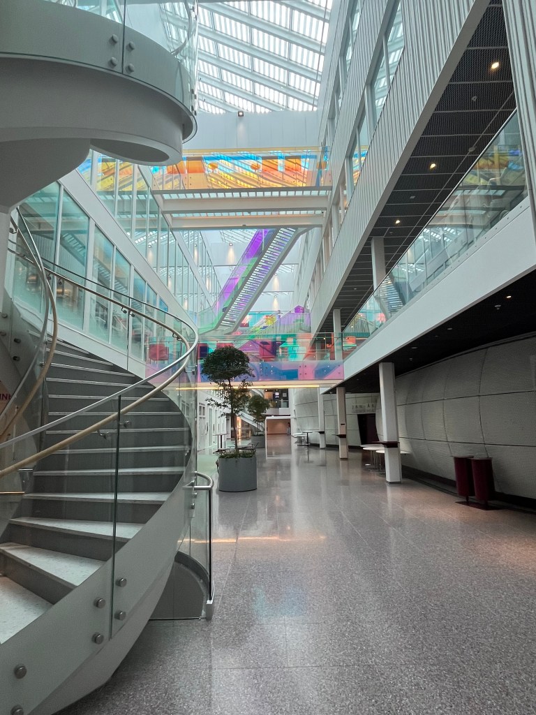 Work is…well, it’s about the same as any first week of research in a new lab. Meetings to learn what everyone’s research is about, paperwork to get a key card for the building and server access, reading lots of background papers, etc. You know the drill. The building I work in is nice, though! It’s fairly new, and I like the atrium.