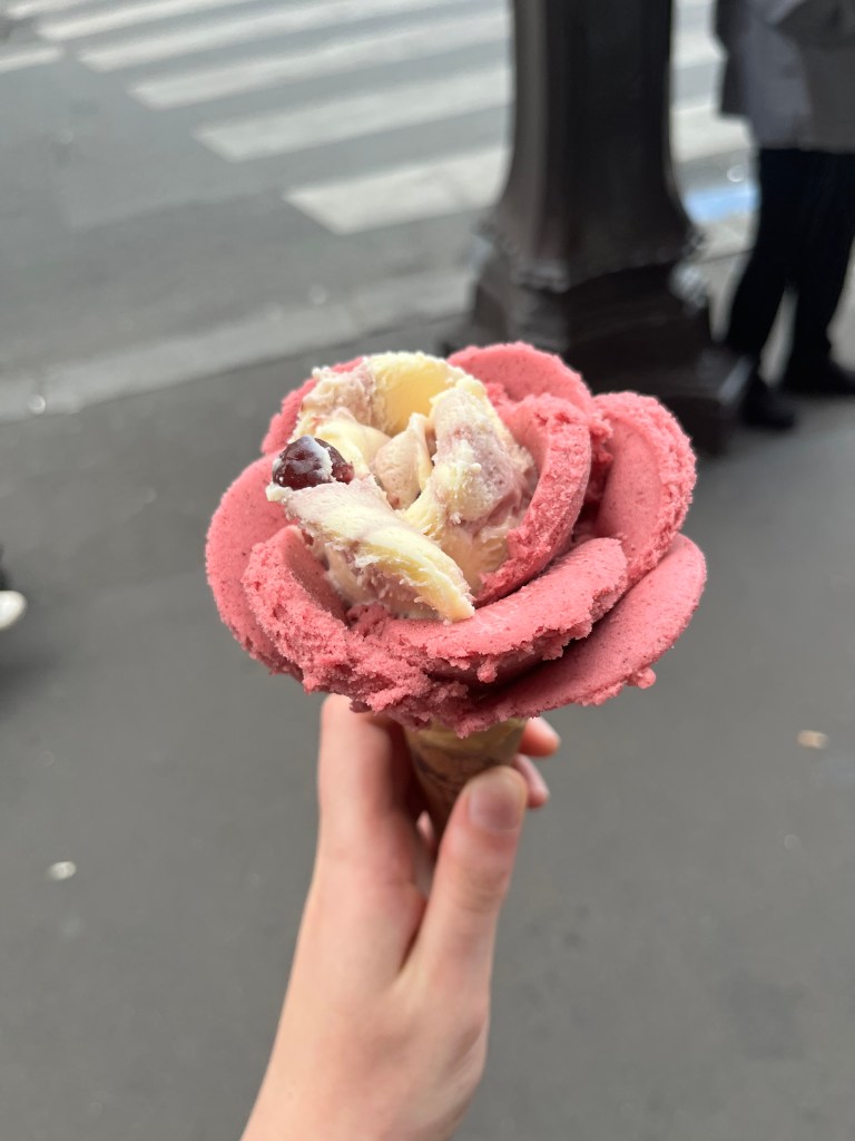 After the Palais, I had to hurry over to my entrance time-slot at the Louvre, but I had enough time to grab a fancy rose-shaped gelato cone outside the Palais. Pear-hibiscus gelato on the outside and amarena cherry cream swirl on the inside!