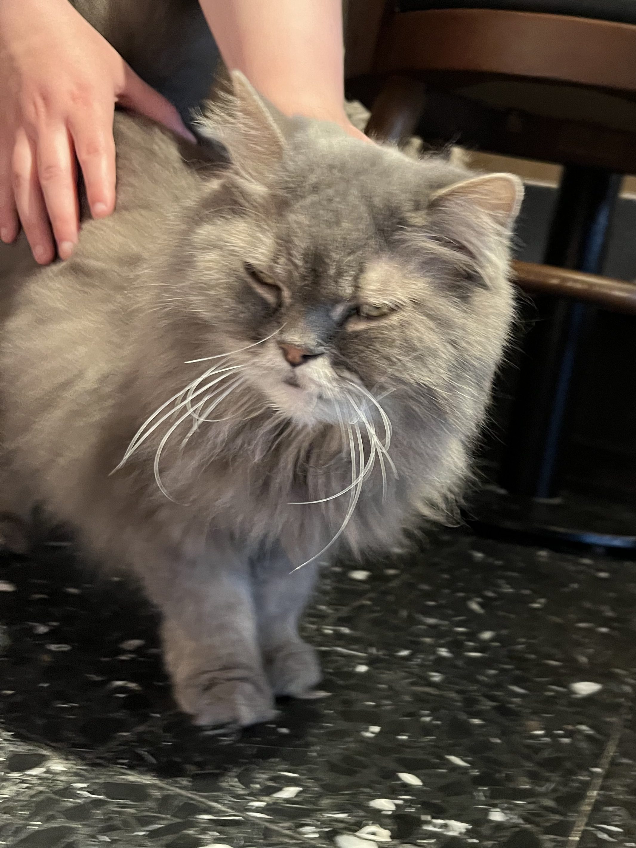 …I’m getting out of temporal order, though, so rolling it back to the weekend where we begin my personal definition of a week: my Big Exciting Outing consisted of another trip to the cat café, where I met another lovely couple of friends.